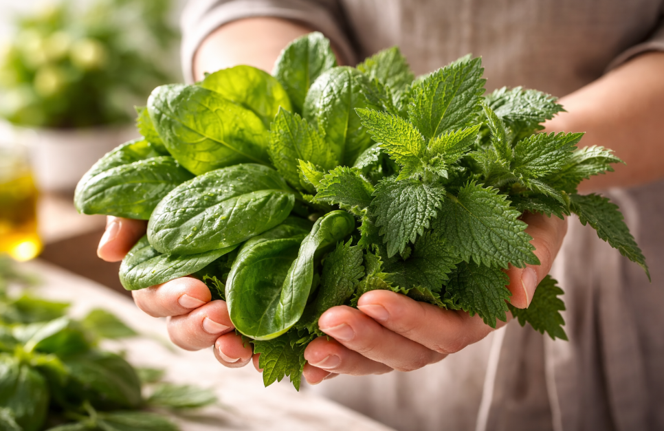 Свежая крапива или шпинат дают изумрудный цвет. Вот ваша идеальная пара для глубокого зелёного оттенка. Выбирайте в зависимости от того, что найдёте — оба варианта дают практически одинаковый результат.
