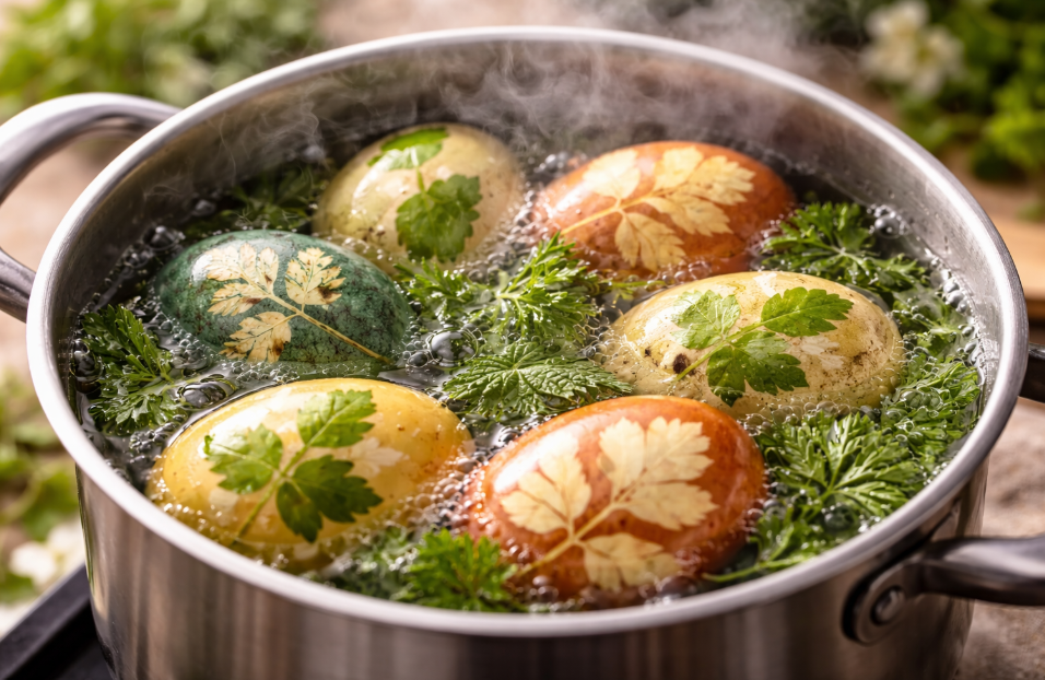 Почему именно эти травы? Натуральные ингредиенты дают спокойные, глубокие оттенки, а главное — не впитываются в белок сквозь микротрещины. То есть даже если на скорлупе образуются маленькие трещинки при варке (что случается часто), краска останется снаружи и не испортит внешний вид яйца.