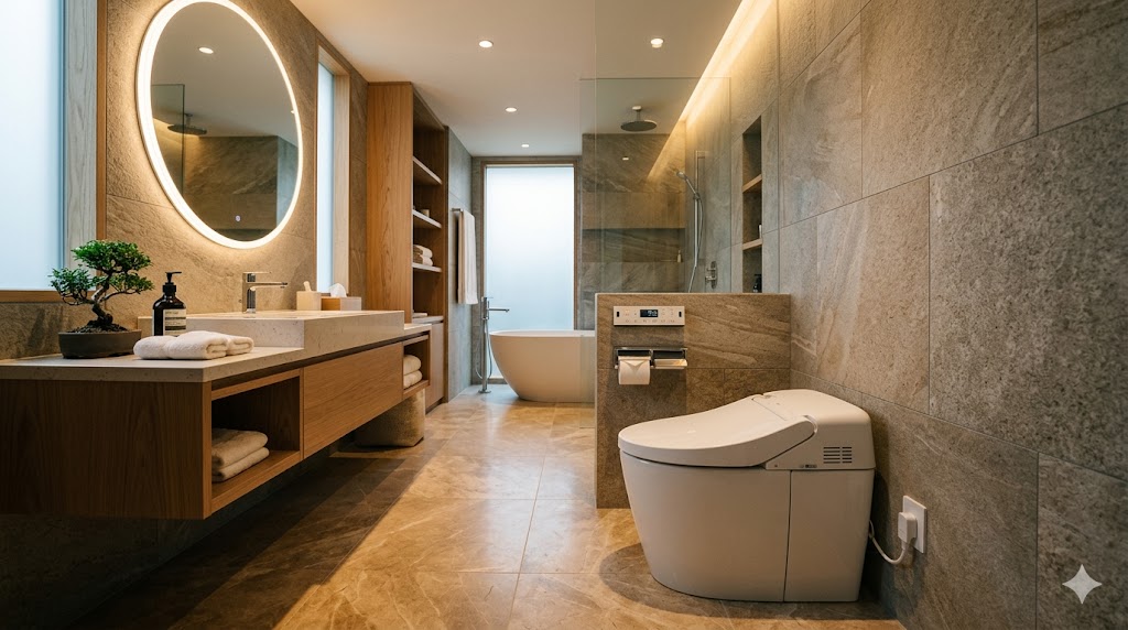 Современный японский умный унитаз с электронным управлением в стильном интерьере