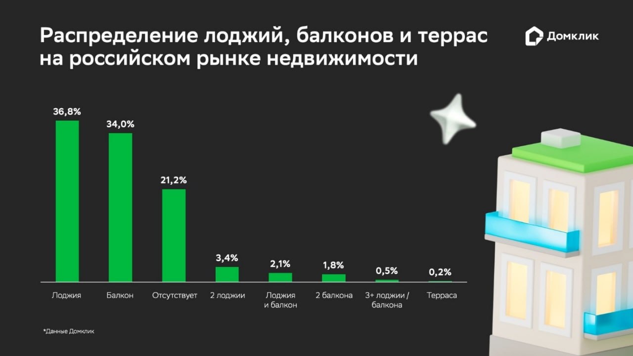 Аналитики Домклик проанализировали данные о российских квартирах и выяснили, как часто в них встречаются балконы, лоджии и террасы.